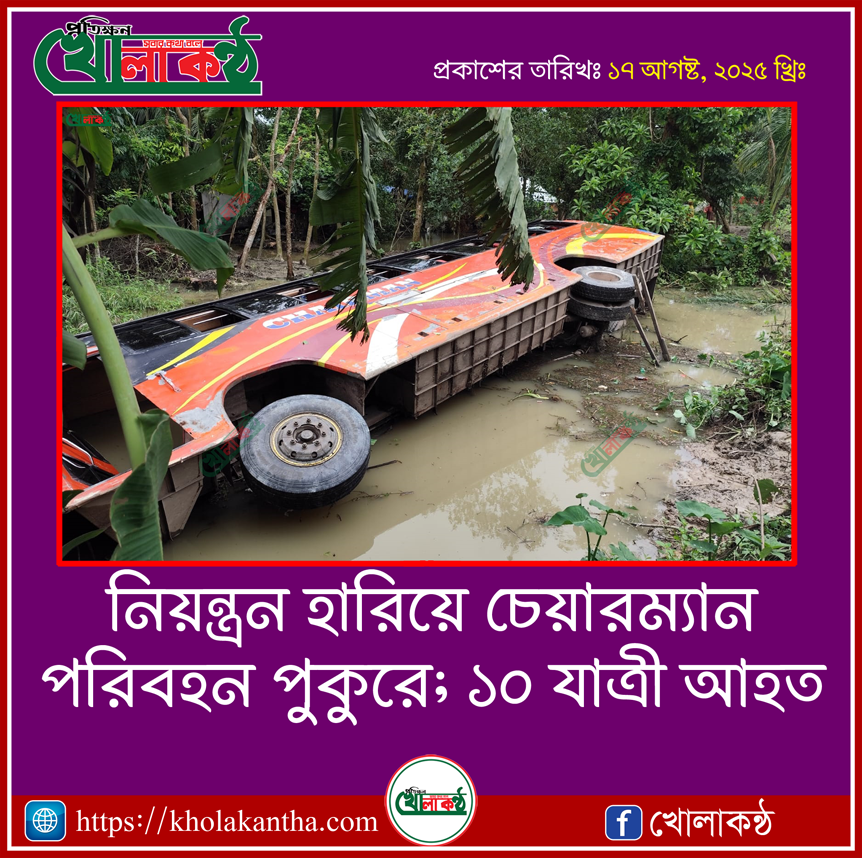 পটুয়াখালীর বাউফলে ঢাকা গামী চেয়ারম্যান পরিবহন নামে একটি যাত্রীবাহী বাস নিয়ন্ত্রণ হারিয়ে সড়কের পাশের পুকুরে পড়ে যায়। এতে অন্তত ১০ জন যাত্রী আহত হয়েছেন। দুর্ঘটনাটি ঘটে শনিবার (১৬ আগস্ট) দিবাগত রাত ১টার দিকে।