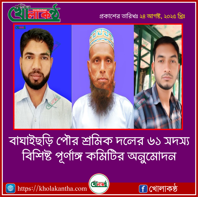 রাঙ্গামাটির বাঘাইছড়ি পৌর শ্রমিক দলের ৬১ সদস্য বিশিষ্ট পূর্ণাঙ্গ কমিটির অনুমোদন দিয়েছে জেলা শ্রমিক দল। গত ২২ আগস্ট ২০২৫ তারিখে জেলা শ্রমিক দলের সভাপতি মমতাজ মিয়া, সাধারণ সম্পাদক মোঃ কবির ইসলাম (কবির) ও সাংগঠনিক সম্পাদক মোজাফফর হোসেন স্বাক্ষরিত এক বিজ্ঞপ্তির মাধ্যমে এই অনুমোদন প্রদান করা হয়।