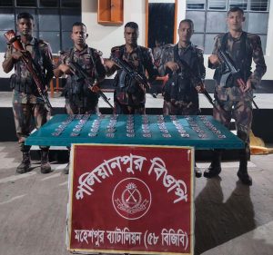ঝিনাইদহের মহেশপুর সীমান্তে বিজিবি’র অভিযান অব্যাহত। ১৬ নভেম্বর ২০২৫ তারিখ, মহেশপুর ব্যাটালিয়ন (৫৮ বিজিবি) পৃথক অভিযানে মাধবখালী বিওপি এলাকা থেকে ৯৯ বোতল ভারতীয় ফেন্সিডিল এবং পলিয়ানপুর বিওপি এলাকা থেকে ২৮৮ পিচ ভায়াগ্রা উদ্ধার করে।